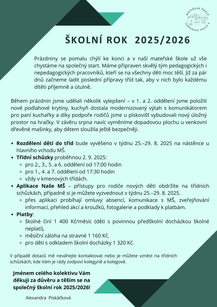 Školní rok 2025/2026 bude zahájen 1. září 2025. Více informací k organizaci začátku školního roku naleznete v příspěvku.